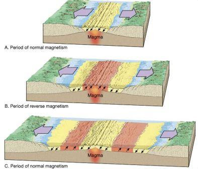 Ketika kita memperhatikan polaritas magnetik batuan di lantai samudera. Polaritasnya akan terlihat berarah bolak-balik pada lapisan batuan secara bergantian, membentuk image seperti cermin pada kedua sisi pematang tengah samudera.