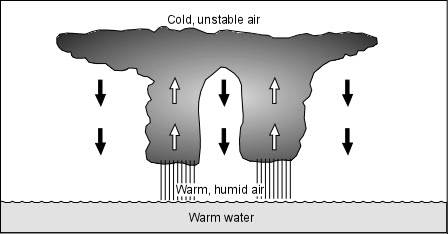 Disebut sebagai updraft, udara naik ini akan membentuk awan hingga ketinggian 6000 m (6 km). Apabila udara hangat naik lebih tinggi lagi, dan mendingin di antara awan yang telah terbentuk akan mengakibatkan pengembunan lebih banyak dan terbentuknya kristal es. Pelepasan panas akibat pembentukan kristal dan pengembunan ini mengakibatkan terbentuknya awan hingga ketinggian 12 km. Ketika titik-titik air dan kristal es akan semakin besar dan semakin berat, titik air dan kristal es mulai jatuh dengan cepat (downdraft) di muka awan, karena beratnya tidak bisa ditahan oleh udara naik.